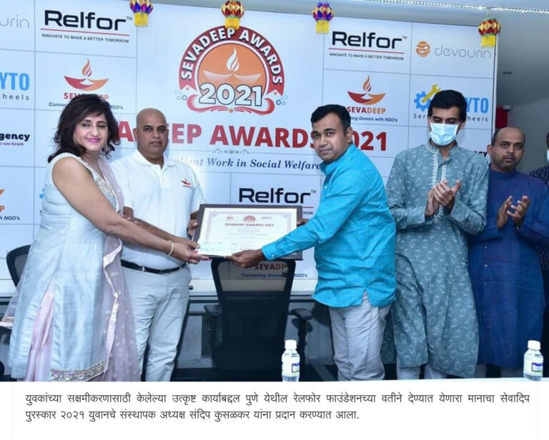 युवानचे संस्थापक संदिप कुसळकर यांना 5 लाखाचा सेवादीप पुरस्कार.