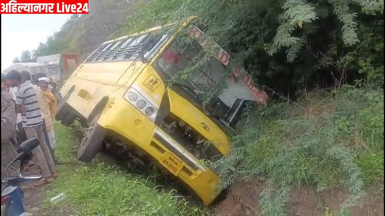 संगमनेरच्या चंदनापुरी घाटात विद्यार्थ्यांना शाळेत घेऊन जाणारी स्कूलबस उलटली, ४ विद्यार्थी किरकोळ जखमी