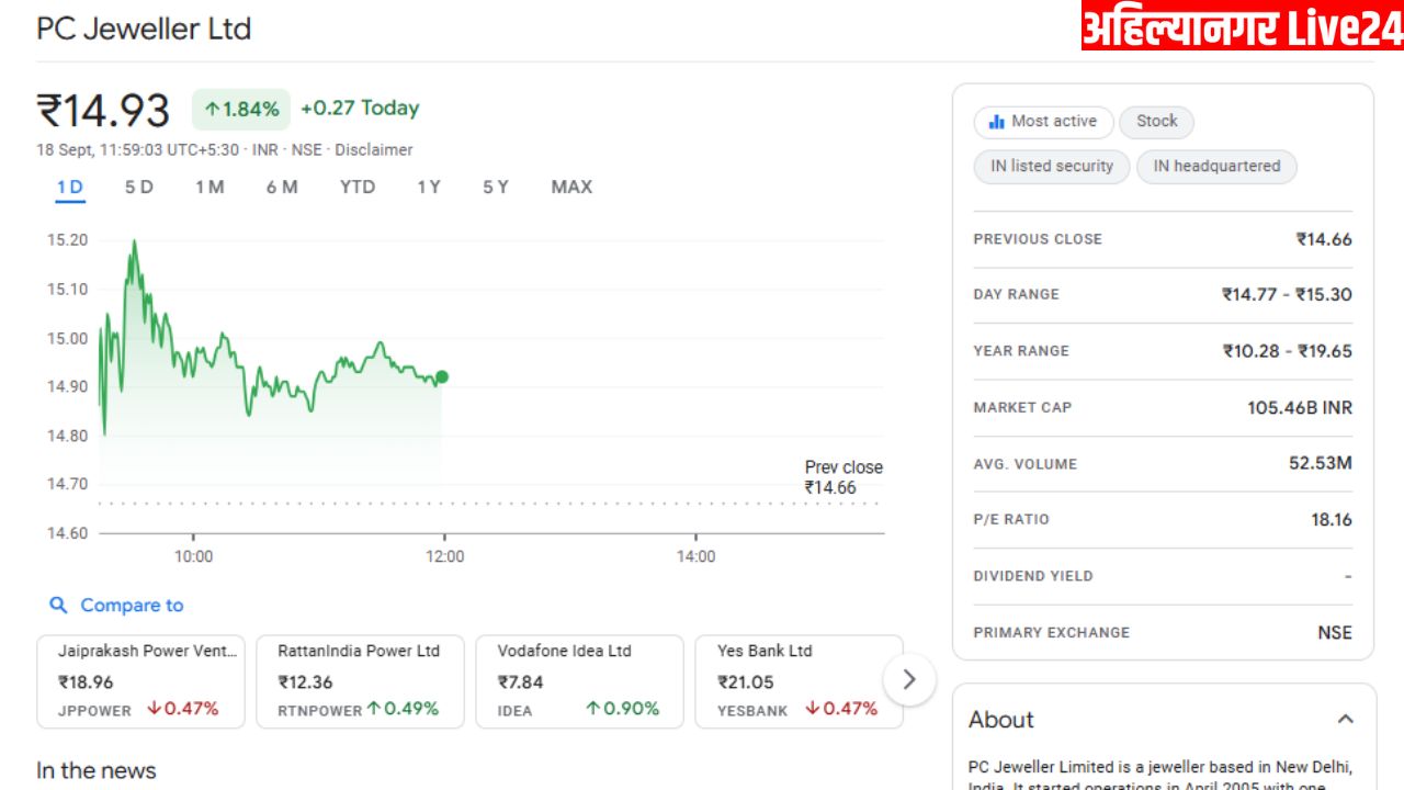 18 सप्टेंबर 2025 रोजी पीसी ज्वेलर्सच्या शेअरची ओपनिंग प्राईस 15 रुपये दिसून आली व सध्या हा शेअर 14.97 रुपयांवर ट्रेड करत आहे. तसेच आज सुरुवातीपासूनचा परफॉर्मन्स बघितला तर या शेअरची आतापर्यंतची कमाल किंमत 15.30 रुपये राहिली असून किमान किंमत 14.77 आहे. तसेच 52 आठवड्याची कमाल किंमत ही 19.65 रुपये तर किमान किंमत 10.28 रुपये इतकी राहिली आहे.
