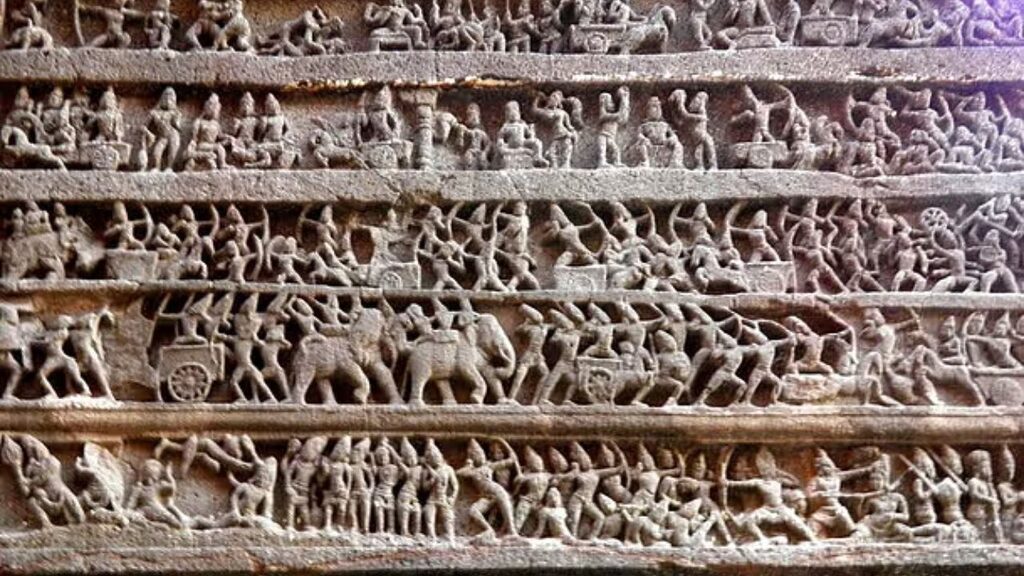 या मंदिरातील कोरीव काम पाहिल्यावर तुमचं लक्ष एका वेगळ्याच गोष्टीकडे जातं. इथं तुम्हाला रामायण आणि महाभारताच्या कथा शिल्पांच्या रूपात कोरलेल्या दिसतात. अगदी प्रभू रामाचा वनवास, रावणवध, अर्जुनाचा गांडीव घेऊन उभा असलेला युद्धभूमीतील क्षण हे सारे प्रसंग अक्षरशः दगडांमध्ये जिवंत वाटतात. त्यामुळे हे मंदिर केवळ एक धार्मिक स्थळ राहत नाही, तर भारतीय संस्कृतीचं आणि अध्यात्मिकतेचं जिवंत रूप बनून उभं राहतं.