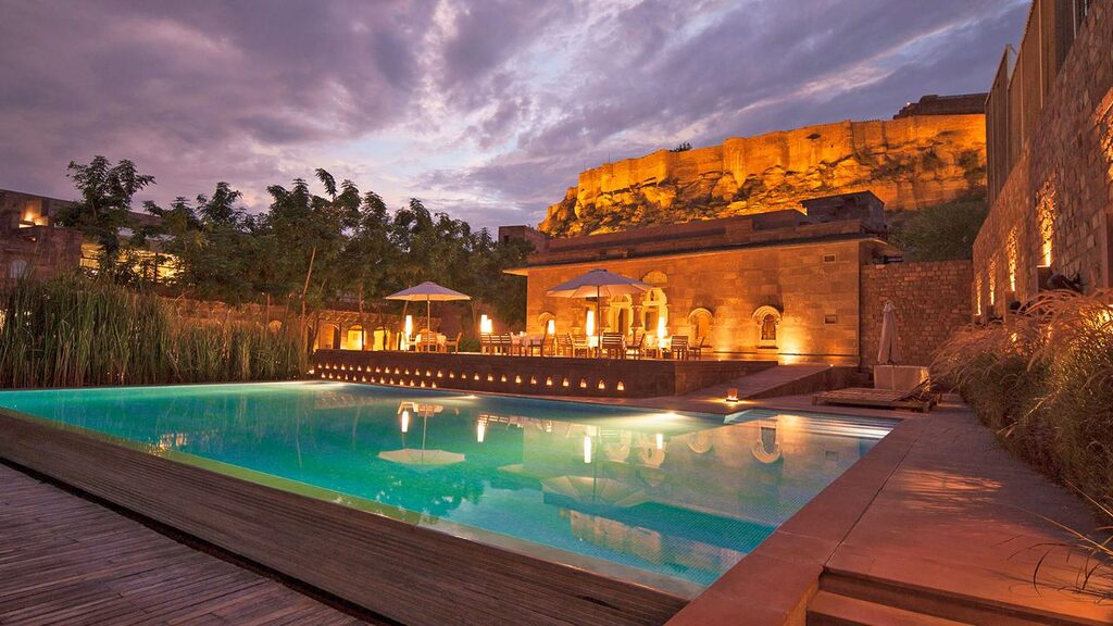 जोधपूरमध्ये, मेहरानगड किल्ल्याच्या छायेत वसलेले ‘RAAS’ हॉटेल हे आधुनिकतेचा आणि परंपरेचा उत्तम संगम आहे. लाल दगडात बांधलेली ही वास्तू, जुन्या हवेलीचा आदर राखून तयार केलेली आहे. येथे तुम्ही आधुनिक बुटीक अनुभव घेऊ शकता, पण त्याचवेळी दरवाज्याच्या बाहेर नजर टाकल्यावर तुम्हाला दिसेल तो ऐतिहासिक किल्ला, जणू तुमच्या राहण्यावर नजर ठेवतोय. इथे दिवसा भव्य अंगणात झोपाळ्यावर वेळ घालवता येतो आणि रात्री त्या जुन्या भिंतींच्या सावलीत बैठकीचा अनुभव घेत, इतिहासाशी संवाद साधता येतो.