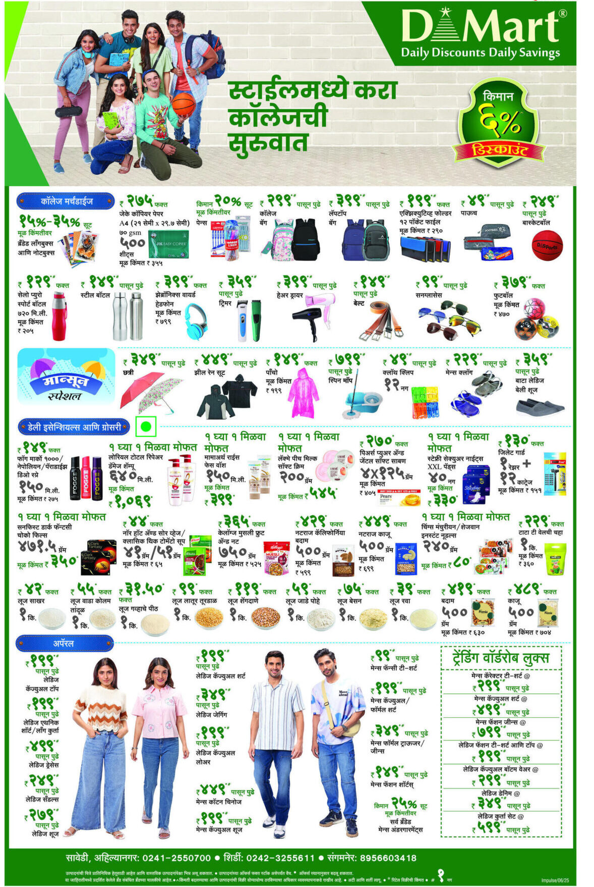 अहिल्यानगर शहरातील लोकप्रिय सुपरमार्केट डी-मार्टने ‘स्टाईलमध्ये करा कॉलेजची सुरुवात’ आणि ‘मान्सून स्पेशल’ या आकर्षक ऑफर्सची घोषणा केली आहे. या अंतर्गत, कॉलेजच्या वस्तूंपासून ते किराणा आणि कपड्यांपर्यंत सर्व उत्पादनांवर किमान ६% सवलत दिली जात असून, अनेक वस्तूंवर ‘एक घ्या, एक मिळवा’ सारख्या बंपर ऑफर्सने ग्राहकांना आकर्षित केले आहे.